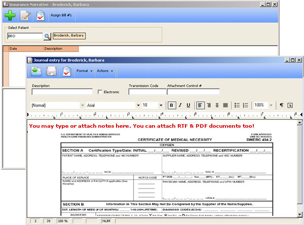 In today’s insurance environment, doctors often need to add an insurance narrative, such as Certificate of Medical Necessity, for certain types of claims. MedOffice allows you to link a specific claim with its narrative, as shown here. You can type notes and attach to any claim detail line!
